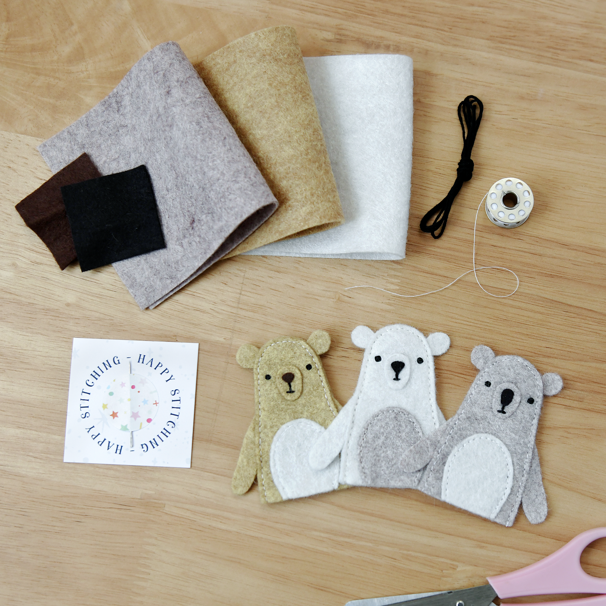 The plastic free sewing kit includes everything you need to make three felt bears, all you need to provide is a pair of scissors.