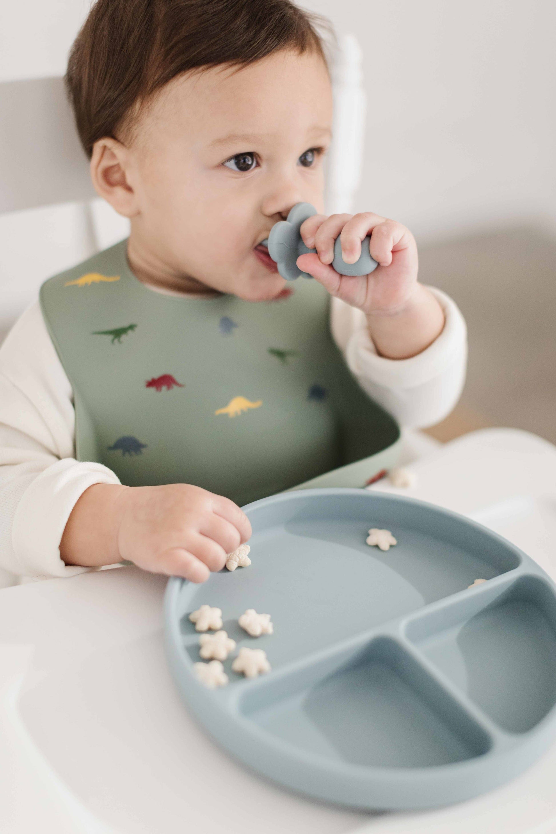 This silicone divider plate suctions to surfaces to help minimize spills and messes as baby learns to self-feed. The plate is divided into three sections to help offer a variety of foods at mealtime! Product Details & Care: -Suctions to surface to prevent spills -100% Food grade silicone -Free from BPA, PVC, Phthalates and toxic metals -Recommended for age 4 Months and Up -Dishwasher Safe -Microwave Oven Safe -Size: 8" D x 1.25" H