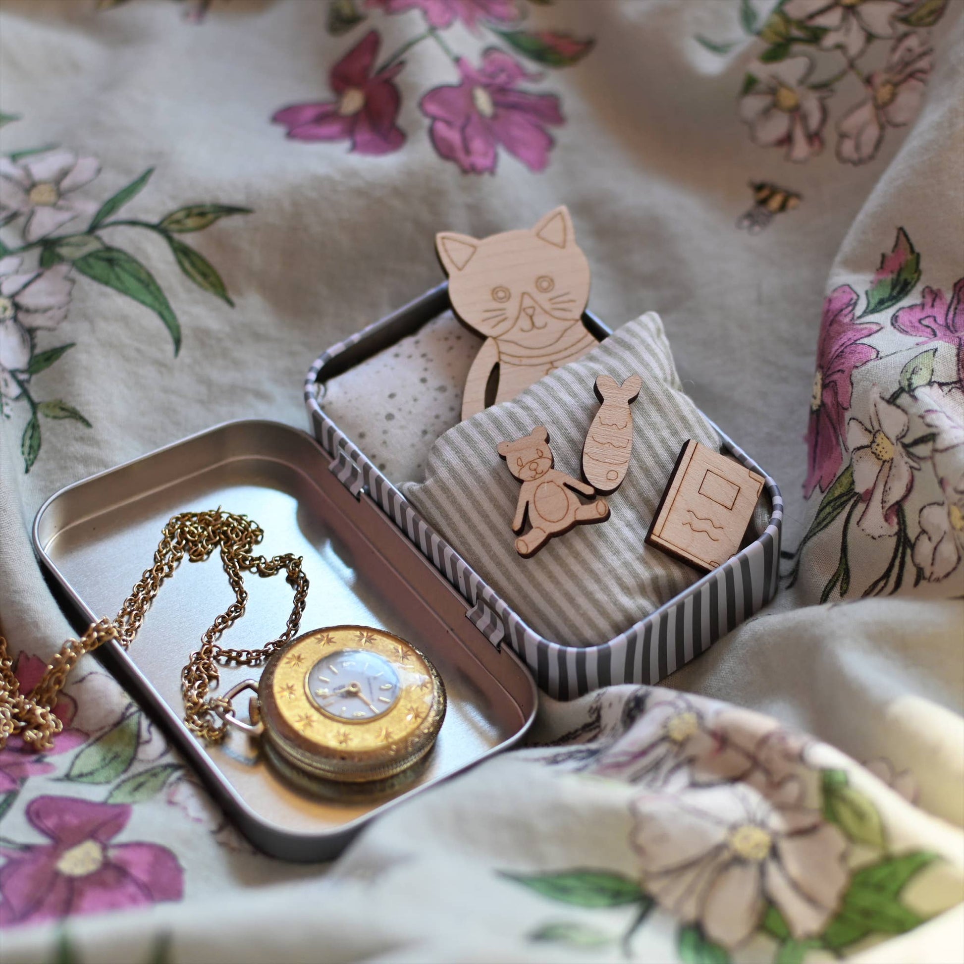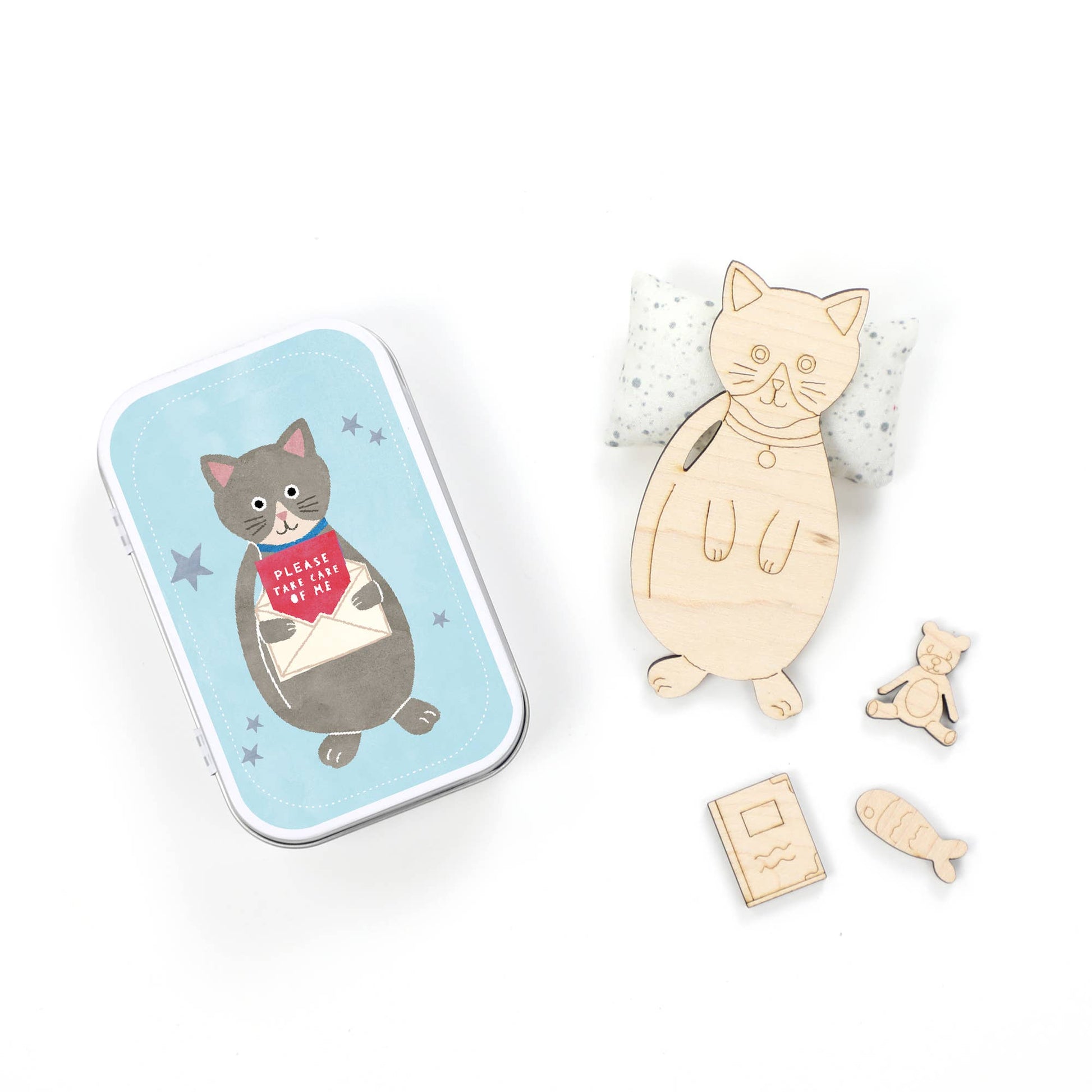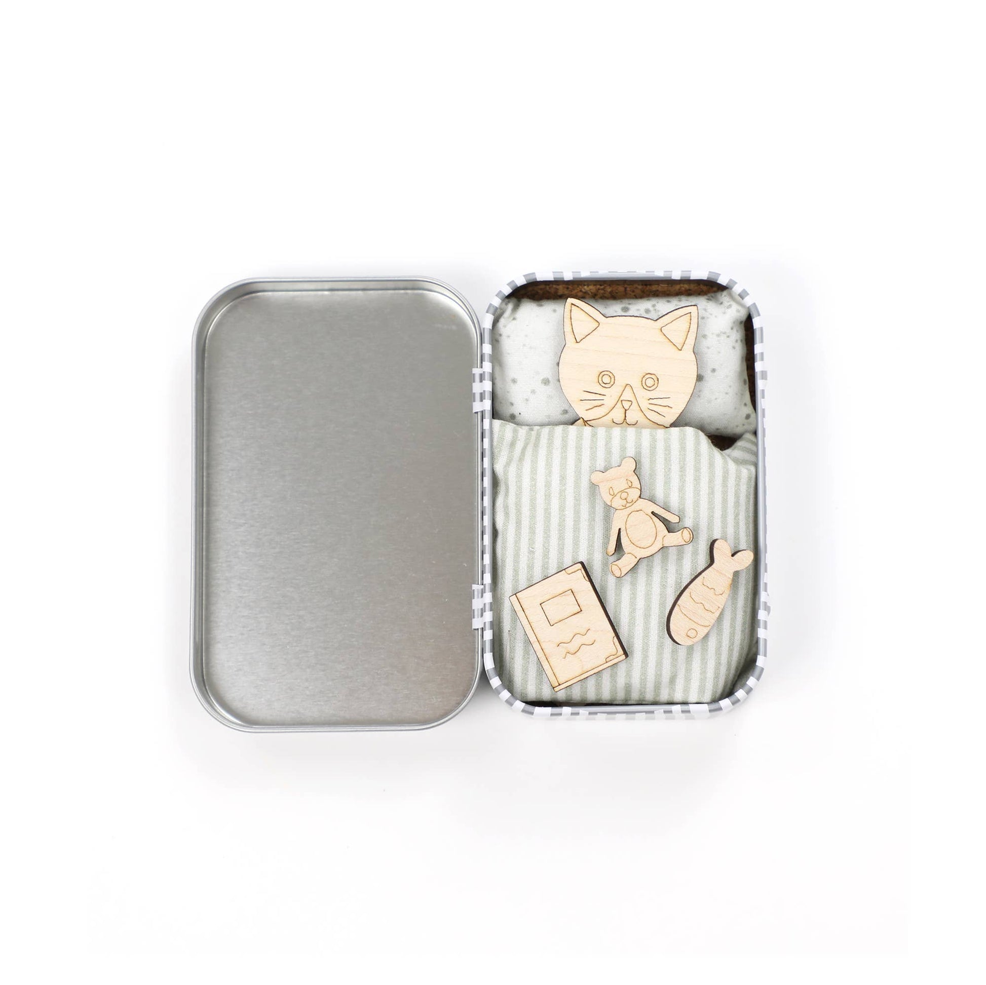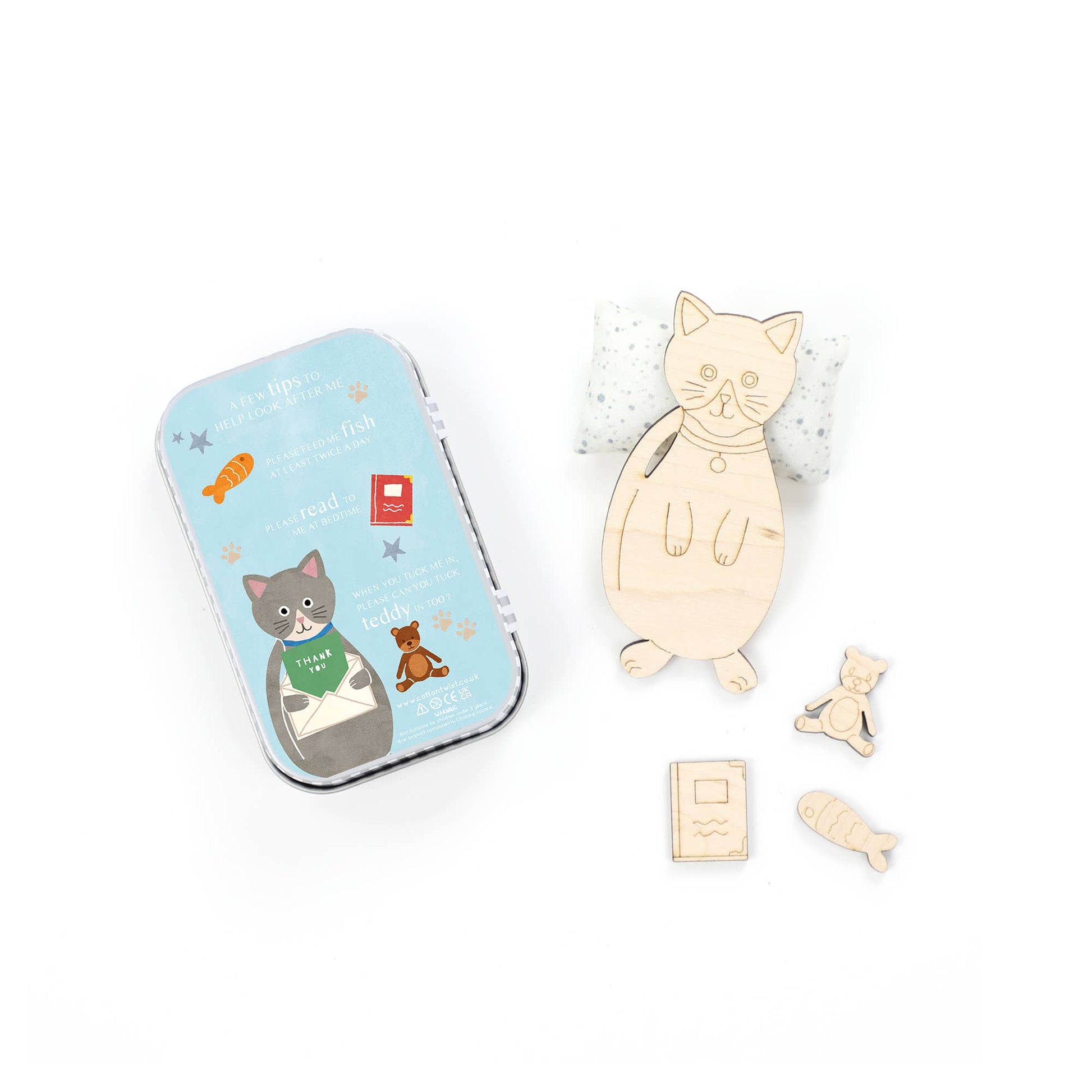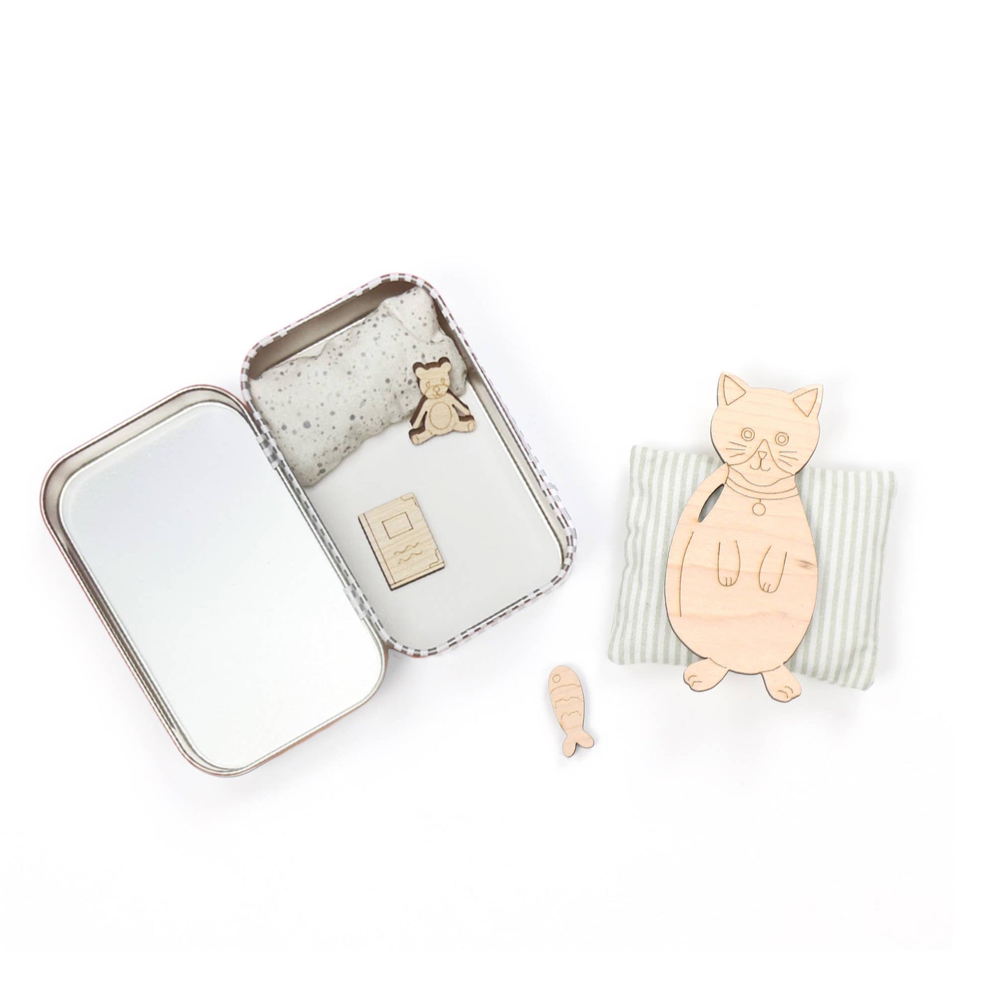 This mini maple wood cat is ready for its new home, & is looking for a lovely owner to help look after it. Each cat is housed in our sweet stripy tins along with a cosy duvet & pillow, a little teddy, a book & a tasty treat, in this case a little fish.