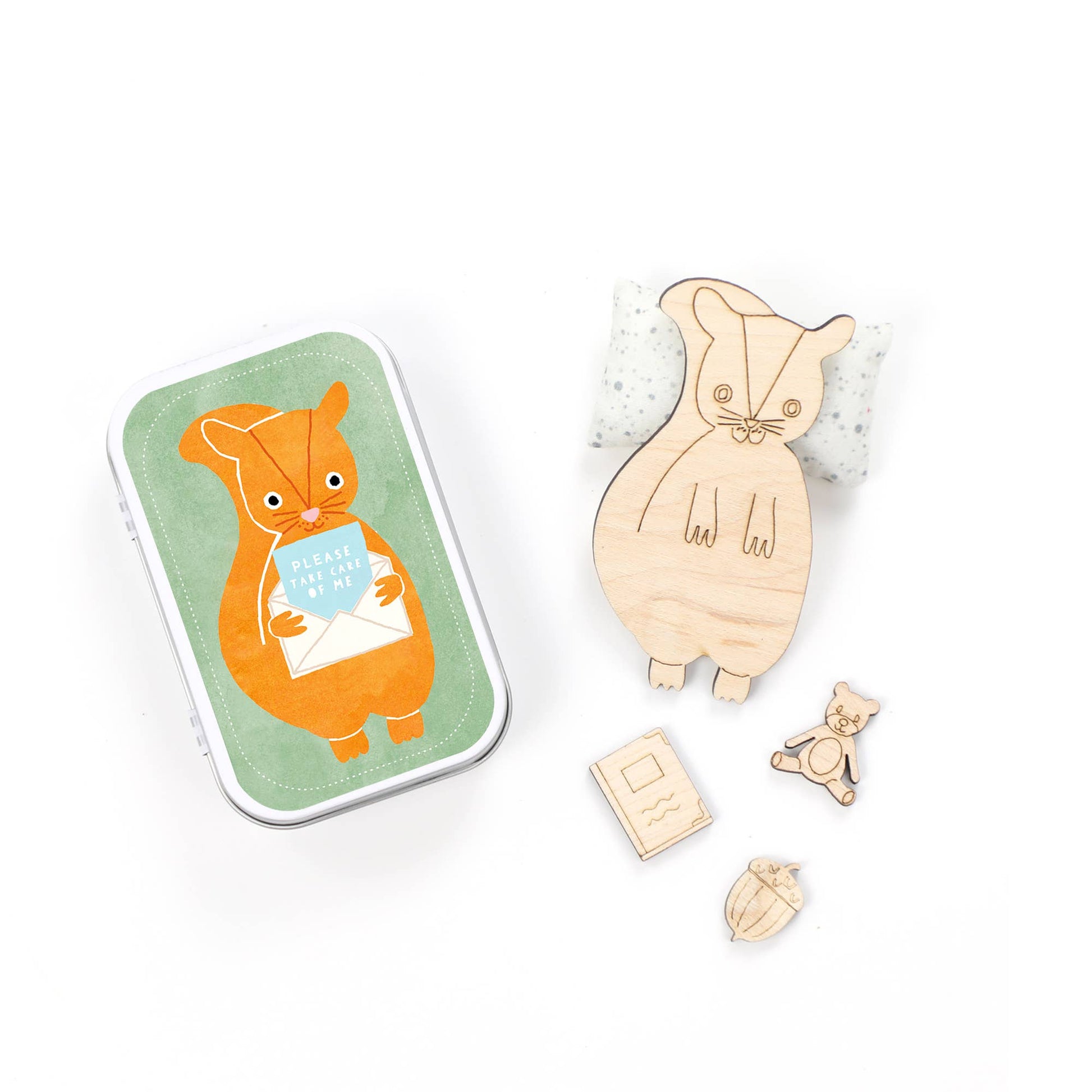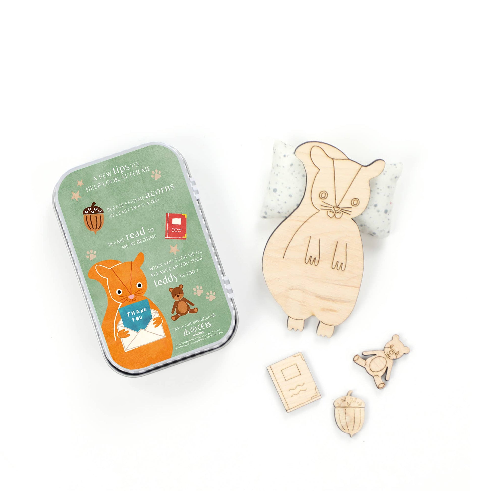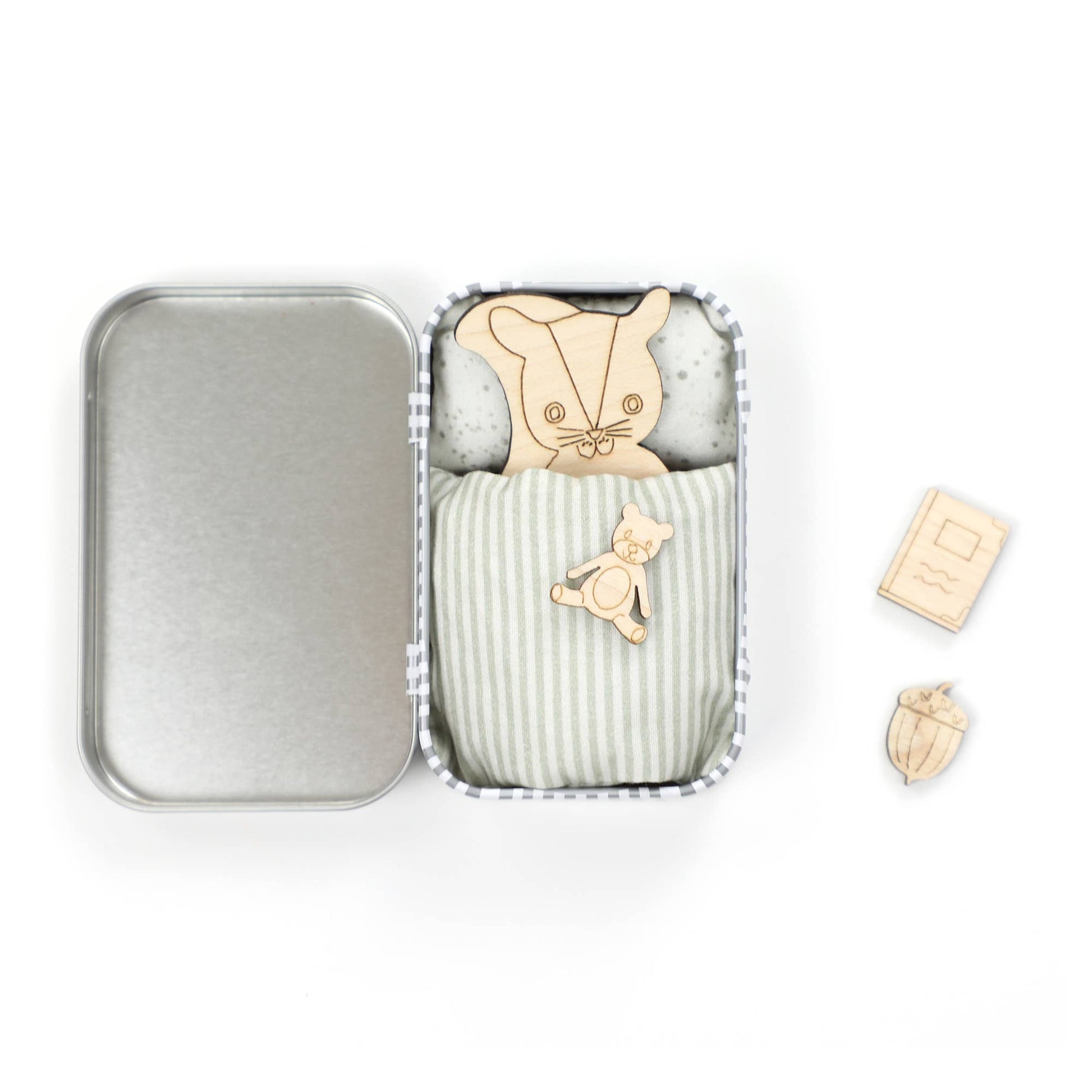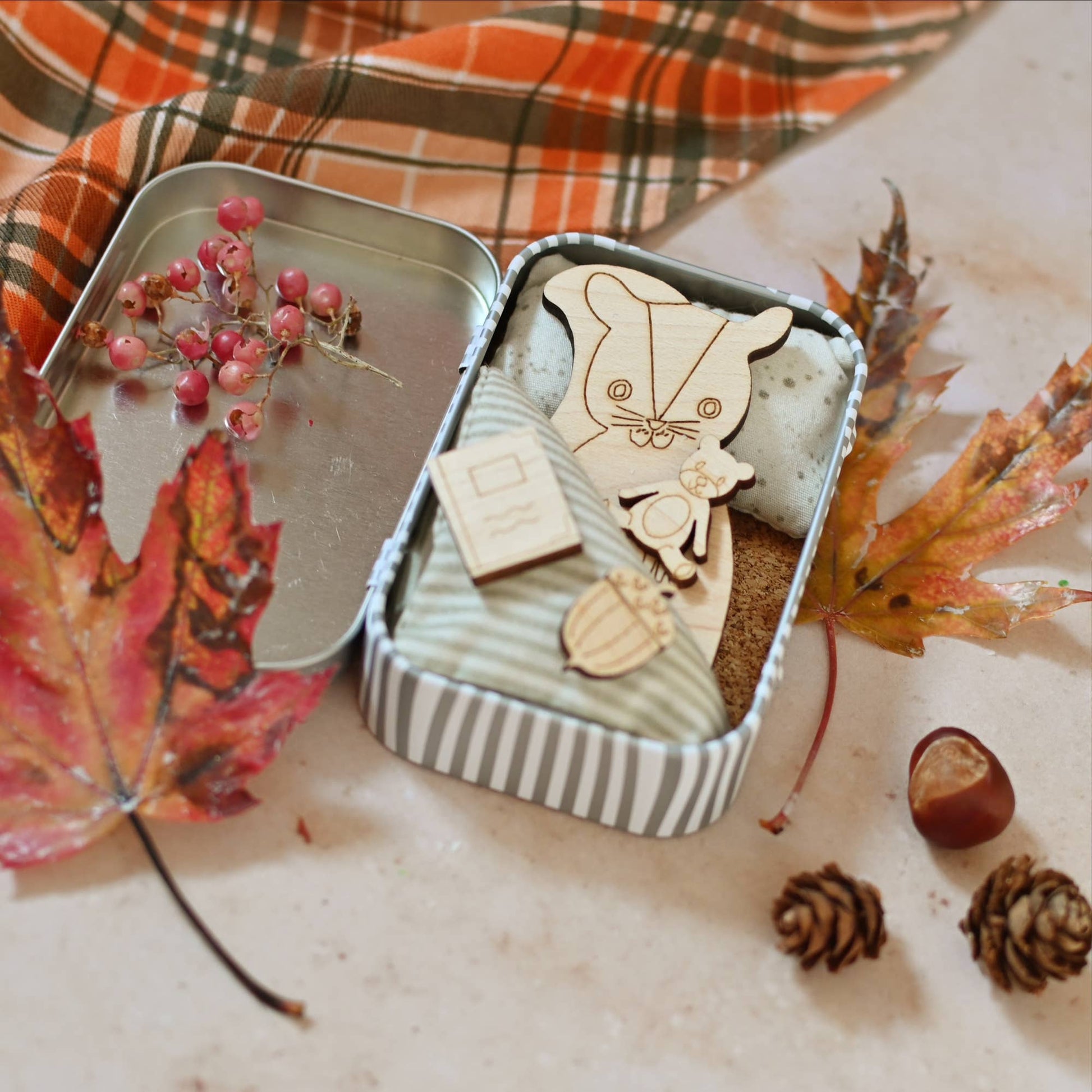 This mini maple wood squirrel is ready for its new home, & is searching for a lovely owner to help look after it. Each squirrel is housed in our sweet stripy tins along with a cosy blanket & pillow, a little teddy, a book & a tasty treat, in this case a crunchy acorn.